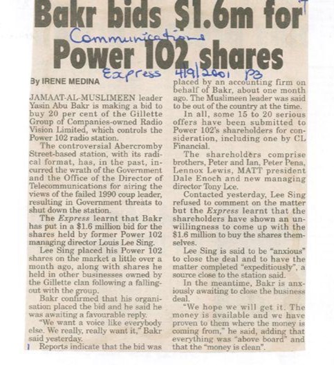 JAMAAT AL MUSLIMEEN leader Yasin Abu Bakr is making a bid to buy 20 per cent of the Gillette Group of Companies-owned Vision Radio Ltd which controls the Power 102 radio station.